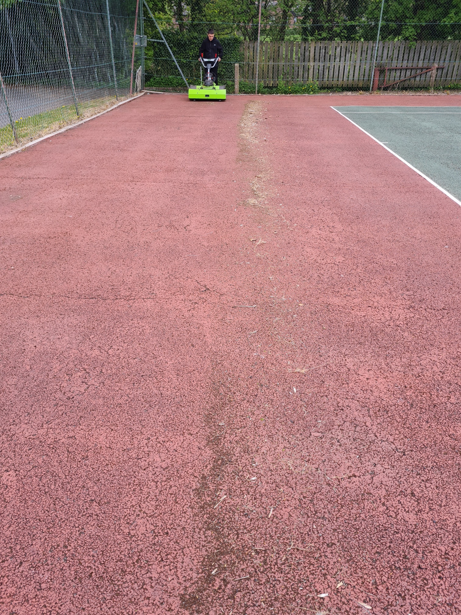 We have a wide range of brushes that can be used, surface dependant and do not remove paint from the Tennis courts or remove the white line markings defining the courts.